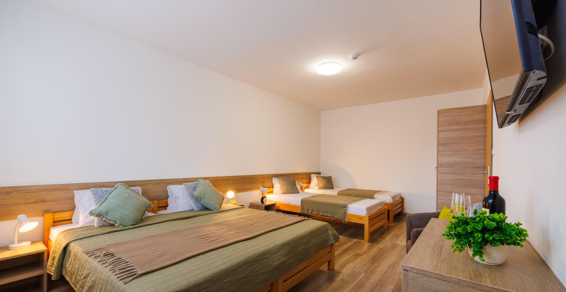 Two connected rooms, private bathroom and kitchenette. Ideal for families and longer stays.